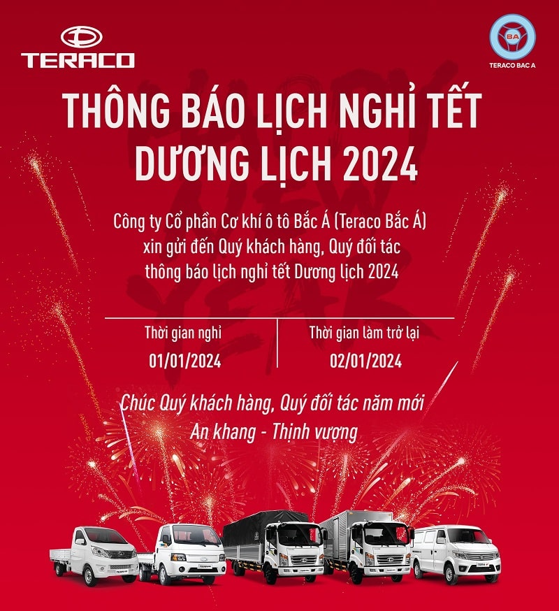 Công ty Cổ phần Cơ khí ô tô Bắc Á (Teraco Bắc Á) xin gửi đến Quý khách hàng, Quý đối tác thông báo lịch nghỉ tết Dương lịch 2024 như sau: